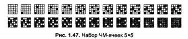 Положительная черта способа ЧМ — меньшая заметность структуры растра. Однако его использование затруднено в случае, когда размер пикселов больше, чем их шаг. Начиная с определенной густоты, пикселы смыкаются. Кроме того, на дискретном растре невозможно обеспечить плавное изменение густоты (частоты), в особенности для ячеек небольшого размера. Рассмотрим пример ячеек 5 х5, реализующих ЧМ-дизеринг (рис. 1.47).