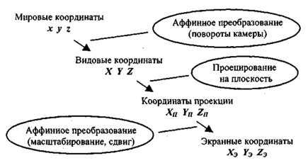 Представим цепочку преобразований координат от мировых к экранным следующим образом (рис. 2.26):