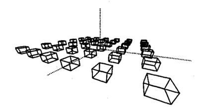 В случае короткофокусной камеры (zK = 1200) восприятие перспективы наиболее заметно для кубов, которые расположены ближе всего к камере. Вертикальные линии объектов не являются вертикалями на проекции (объекты разваливаются").