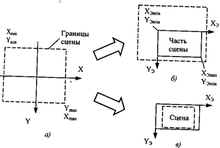 а — границы сцены в координатах проекции; б— в окне часть сцены, в — вся сцена с сохранением пропорций вписана в окно