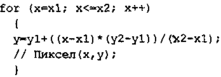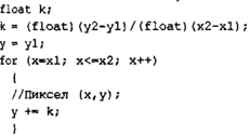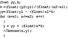 Поскольку мы решили использовать операции с плавающей точкой, то попробуем еще уменьшить количество операций в цикле. Если раскрыть скобки в выражении у = у1 + (х – x1)k; то получим у = у1 + х*к – х1 -к. Здесь значение (у1 – х1-к) является константой— эти операции также вынесем из тела цикла.