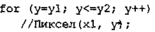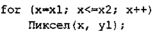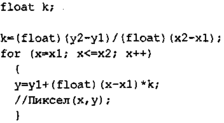 Вычисление текущих координат пиксела здесь выполняется как приращен) по х (необходимо, чтобы х1<=х2), а вывод пиксела обеспечивается функция Пиксел(). Поскольку в языке С, C++ для названия функции нельзя использовать кириллицу, то будем дальше использовать ее как комментарий.