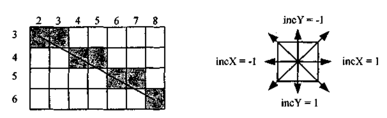 Рассмотрим пример работы приведенного выше алгоритма Брезенхэма для отрезка (х1у1 - х2у2) = (2,3 - 8,6). Этот алгоритм восьмисвязный, то есть при вычислении приращений координат для перехода к соседнему пикселу возможны восемь случаев (рис. 3.3).