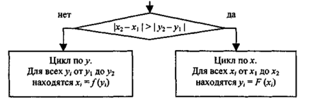 В зависимости от угла наклона прямой выполняется цикл по оси х или по у (рис. 3.2).