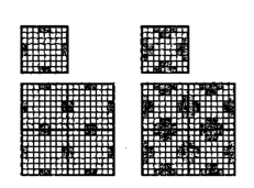 Положительная черта способа ЧМ — меньшая заметность структуры растра. Однако его использование затруднено в случае, когда размер пикселов больше, чем их шаг. Начиная с определенной густоты, пикселы смыкаются. Кроме того, на дискретном растре невозможно обеспечить плавное изменение густоты (частоты), в особенности для ячеек небольшого размера. Рассмотрим пример ячеек 5 ><5, реализующих ЧМ-дизеринг (рис. 1.47).