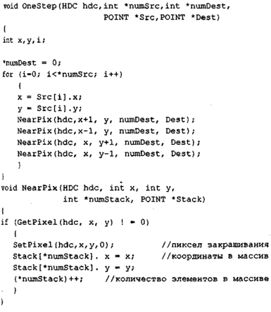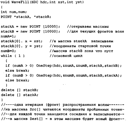 Запишем волновой алгоритм закрашивания на языке C++ с использованием графических функций API Windows.