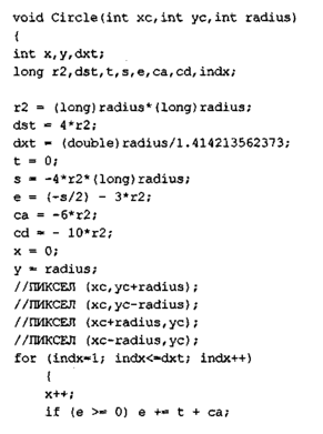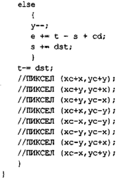 В этом алгоритме использована симметрия круга— в основном цикле вычисляются координаты точек круга только для одного октанта и сразу рисуются восемь симметрично расположенных пикселов [33].