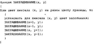 Такое определение функции является рекурсивным. Рекурсия позволяет упростить запись некоторых алгоритмов. Но для этого алгоритма рекурсия порождает существенные проблемы — рекурсивные вызовы функции закрашивание () делаются для каждого пиксела, что обычно приводит к переполнению стека в ходе выполнения компьютерной программы. Практика показывает, что этот алгоритм неприемлем для фигур площадью в тысячу и больше пикселов.