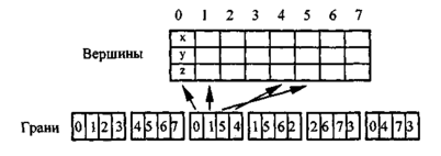 Шесть граней здесь описываются 24 вершинами. Такое представление избыточно — каждая вершина записана трижды. Не учитывается то, что у граней есть общие вершины.