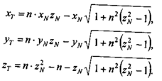 Подставим эти значения в формулы преобразования координат, учитывая, что радиус-вектор нового трассируемого луча направлен противоположно направлению оси Z i+1, то есть (х, у, z) = (-xr, –yr , -zr). Запишем формулы в следующем виде: