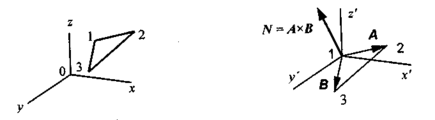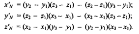 Теперь назовем ребро (1-2) вектором А, а ребро (1-3) — вектором В, как показано на рис. 4.35. Таким образом, положение нормали к грани в пространстве будет описываться радиус-вектором N. Его координаты в системе (х1, у', z1) выразим формулами для векторного произведения: