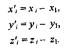 Пусть в пространстве задана некоторая многогранная поверхность. Рассмотрим одну ее плоскую грань в виде треугольника (рис. 4.34). Для вычисления координат вектора нормали воспользуемся векторным произведением любых двух векторов, лежащих в плоскости грани. В качестве таких векторов могут служить и ребра грани, например, ребра 1-2 и 1-3. Однако формулы для векторного произведения были определены нами только для радиус-векторов. Чтобы перейти к радиус-векторам, введем новую систему координат, центр которой совпадает с вершиной 1, а оси параллельны осям прежней системы. Координаты вершин в новой системе: