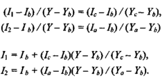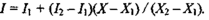 Значения интенсивностей I1 и I2 на концах горизонтального отрезка представляют собой интерполяцию интенсивности в вершинах: