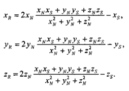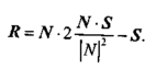 Для решения нашей задачи вначале рассмотрим единичные векторы R1 , S1 и N1. Поскольку векторы нормали, падающего луча и отраженного луча находятся в одной плоскости, то можно записать R1 + S1 = N', где N' — это век» тор, соответствующий диагонали ромба и совпадающий по направлениюc нормалью. Длина вектора N' равна 2cos β. Так как вектор N' по направлению: совпадает с N1 то