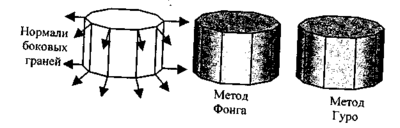 О По нормалям к граням определяются нормали в вершинах. В каждой точке закрашиваемой грани определяется интерполированный вектор нормали.