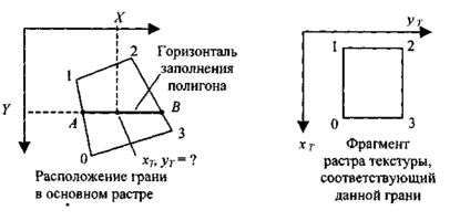 Для рисования каждой грани можно использовать алгоритм вывода полигонов, модифицированный следующим образом. Мы уже рассматривали выше в главе 3 один из алгоритмов вывода полигонов, который рисует полигон горизонталями заполнения внутренних точек. Операции по наложению текстуры удобно встроить в цикл рисования каждой такой горизонтали. При этом в ходе вывода пиксела горизонтали по известным текущим координатам пиксела в основном растре (X, Y) определяются соответствующие координаты (XТ У Т) тексела в растре текстуры. Затем определяется цвет тексела, который и будет определять цвет пиксела в основном растре. Вычислить координаты (х Т, у Т) для каждой точки грани можно следующим образом. Рассмотрим рис. 5.13.