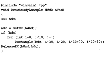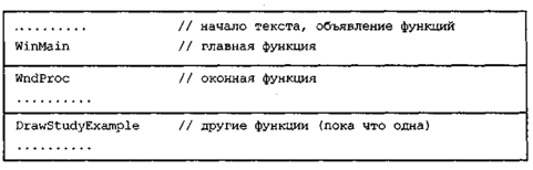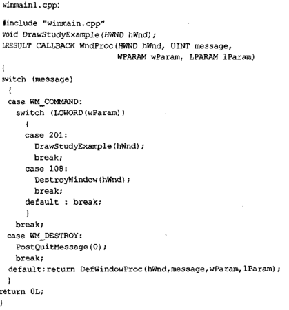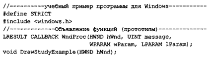В файле winmainl. срр содержится текст оконной функции, объявление фунь ЦИИ DrawStudyExample И директива'#include "winmain. срр", благодаря КОТО рой при компиляции используется текст функции winMain. Следовательно, текст первого примера программы можно трансформировать в такой: