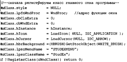 Приведенный выше текст первого примера графической программы для ОС Windows достаточно объемный. Для того чтобы упростить тексты других примеров графических программ, необходимо спланировать наше дальнейшее программирование. Рассмотрим структуру главного файла (studex.cpp):