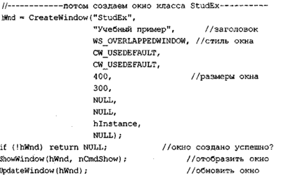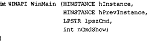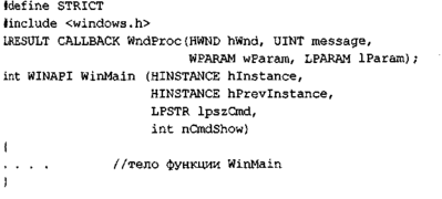 Как видим, программа состоит из трех частей. Первая из них, содержащая функцию winMain, будет присутствовать во всех следующих примерах без всяких изменений. Это достаточно длинный текст, поэтому вместо того, чтобы его каждый раз копировать во всех следующих примерах, создадим отдельный файл, на который будем ссылаться в дальнейшем, и назовем его