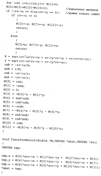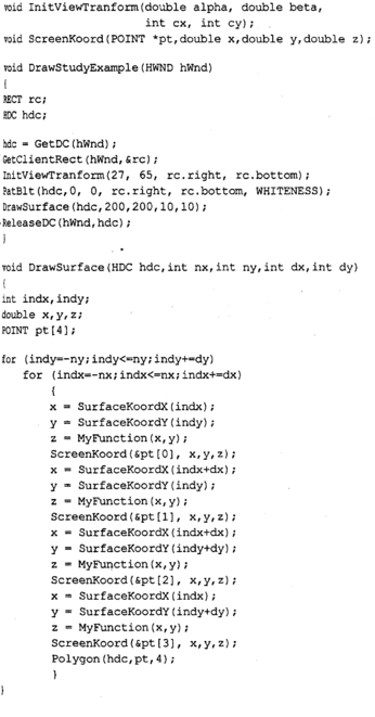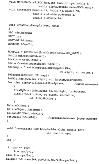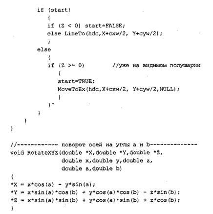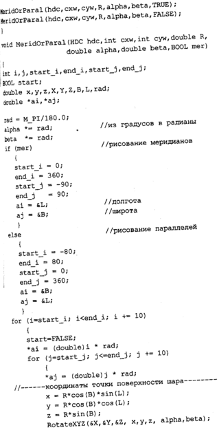 этом примере следующие: а=0... 180, β=45 градусов. ^г^ппетш^ Меридианы и параллели рисуются только для тех точек поверхности, для которых координата Z больше нуля (в повернутой системе). Положительные значения Z соответствуют видимой части шара. Рисование меридианов и параллелей сделано в виде одной функции MeridOrParal для уменьшения размера текста программы. Необходимо отметить, что эта программа разработана как раз для шара. Чтобы