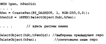 ! Важно то, что, создавая новое перо, нужно обязательно позаботиться об [ уничтожении предыдущего пера. Перо есть объект GDI, для него выделяется специальная область памяти. Перо существует до тех пор, пока его не унич-; тожить. Завершение работы прикладной программы может и не привести к автоматическому уничтожению объектов GDI и освобождению памяти компьютера. Своевременное уничтожение неиспользуемых объектов GDI возлагается на вашу программу. Иначе для некоторых версий Windows могут возникнуть утечки памяти, накопление которых может привести к нежелательным последствиям.