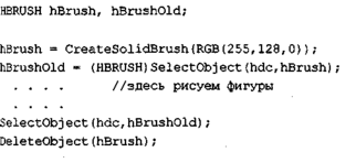 Сплошная кисть создается функцией CreateSoiidBrush. Рассмотрим пример использования оранжевой кисти.