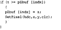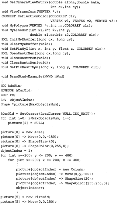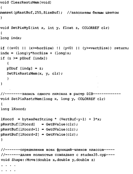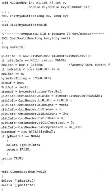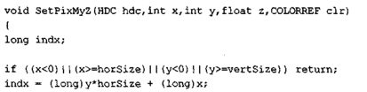Рассмотрим функцию SetPixMyz. Если ее исключить, то прекратится запись пикселов в оба растра — Z-буфера и растра битмапа. Однако те функции, ко-