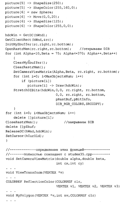Продолжим дальше анализ программы. Временно выключить функцию MyPoiygon нельзя, поскольку тогда будет рисоваться только шар, а это означает другой порядок заполнения пикселами Z-буфера и растра битмапа двойного буфера. По аналогичной причине нельзя временно выключить функцию