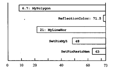 Обратим внимание на эти цифры. Подозрительно много времени занимают операции тела функции MyLineHor. Возможно, ее следует оптимизировать в первую очередь. Следующим в этом списке фигурирует тело функции setPixMyz— 15 сек. Собственное время работы операторов тела функции MyPolygon относительно невелико.