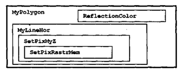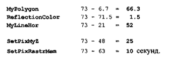 Из этой схемы видно, что собственное время работы функции MyPolygon составляет разность между общим временем работы этой функции и временем работы функций Ref lectionColQE..H MyLineHor: ----