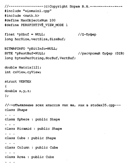 В программе использована одна из функций API Windows для работы с растрами DIB. Это функция stretchDiBits, которая осуществляет вывод растра из памяти по адресу pRastBuf в определенный контекст. Растровый буфер DIB здесь в формате 24-битного цвета— это позволяет достаточно просто моделировать различные интенсивности отражения света для цветных объектов. Для корректности сравнения работы обеих программ (studex34,35) все испытания следует производить в видеорежиме True Color 24 бит на пиксел.