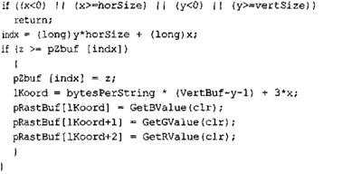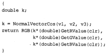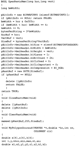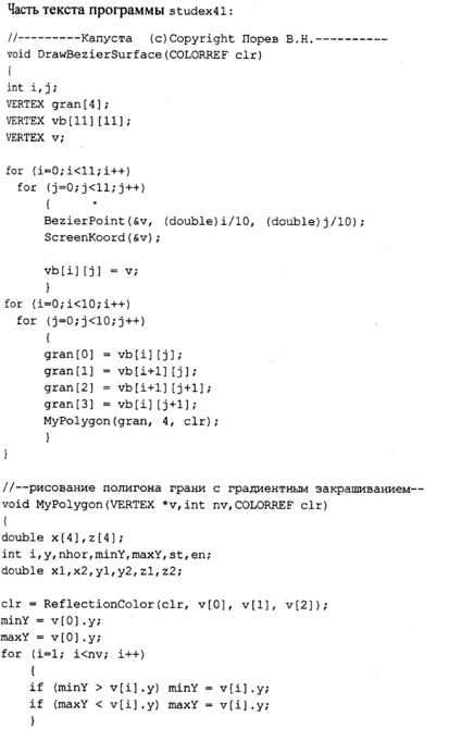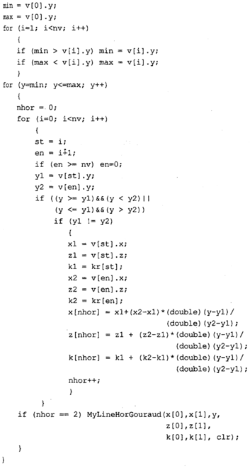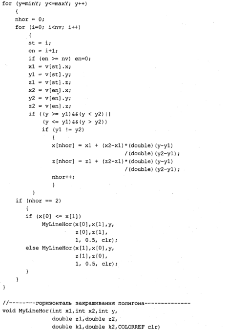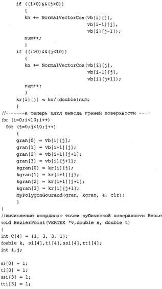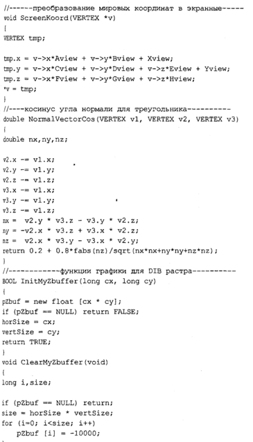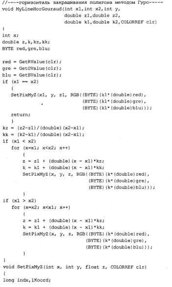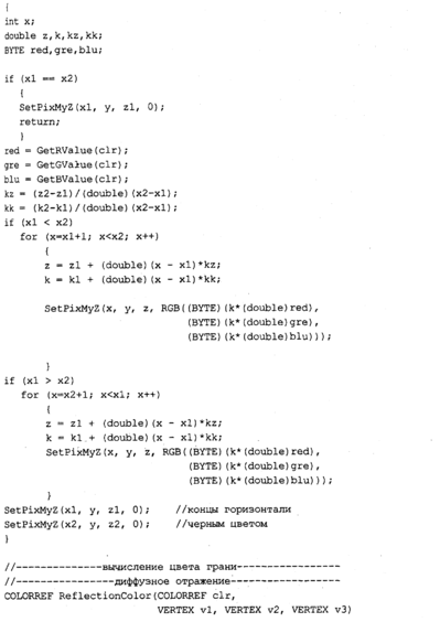 Текст программы приведем только для тех функций, которые изменены. Поскольку метод Гуро здесь уже не используется, то функция MyPolygonGouraud переименована В MyPolygon, a MyLineHorGouraud — В MyLineHor. В теле функции MyPolygon вычисляется цвет грани с помощью новой функции RefiectionCoior. В остальном текст программы идентичен тексту предыдущей программы.