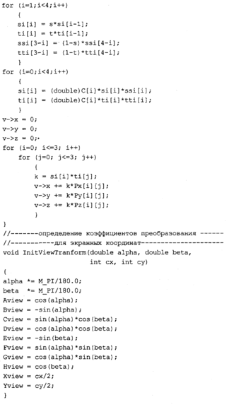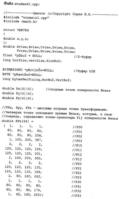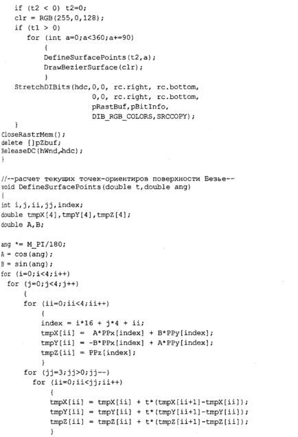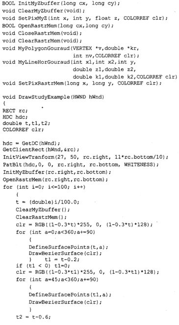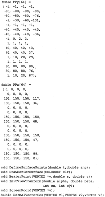 Таким образом, тут используются кривые Безье для описания стадий трансформаций и поверхности Безье в качестве объектов трансформации. Можно это назвать вариацией на тему Безье. Кроме того, здесь мы попрактикуемся в закрашивании поверхностей методом Гуро.