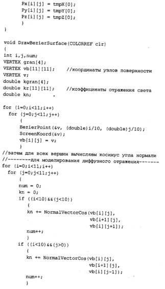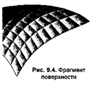 На этом рисунке поверхность выглядит тек-стурированной рельефными ячейками, будто пуховое одеяло. Каждая ячейка— это грань поверхности Безье, которая рисуется так, что цвет закрашивания темнеет слева направо.