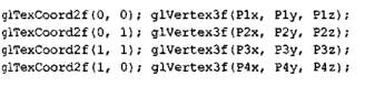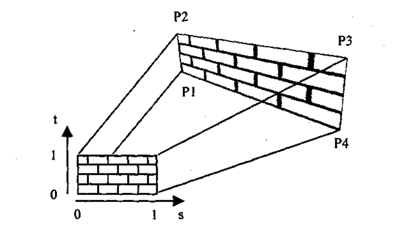 6. При выводе полигональных граней (gljtriangles, gl_quads и им подобных) необходимо указывать соответствие текстурных координат и координат в пространстве объектов. Сделать это можно вызовом функций из семейства giTexCoord. Так, например, функция giTexCoord2f (s,t) указывает на точку с текстурными координатами s и t. Последующий вызов функции givertex3f (x,y, z) одновременно с заданием координат грани также ставит в соответствие координаты (s,t) координатам (x,y,z). На рис. 10.9 показан пример отображения координат четырехугольной грани.