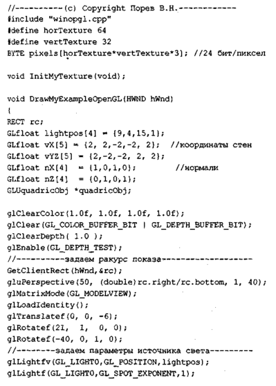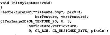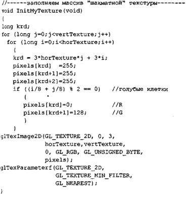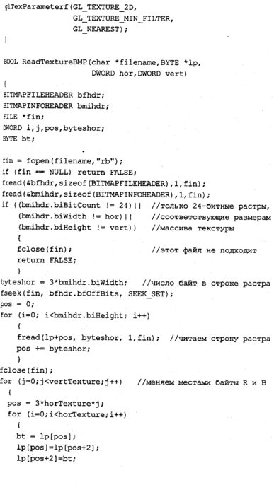 Следует отметить, что приведенная выше функция ReadTextureBMP не является универсальной— она не рассчитана на другие разновидности формата файлов BMP. Эту функцию необходимо существенно видоизменить, если предусматривается чтение, например, и 256-цветных растров. Такие растры читать несколько сложнее, поскольку требуется загружать и устанавливать палитру. В качестве универсального решения для чтения файлов формата BMP можно порекомендовать использовать функцию auxDiBimageLoad из библиотеки glaux.