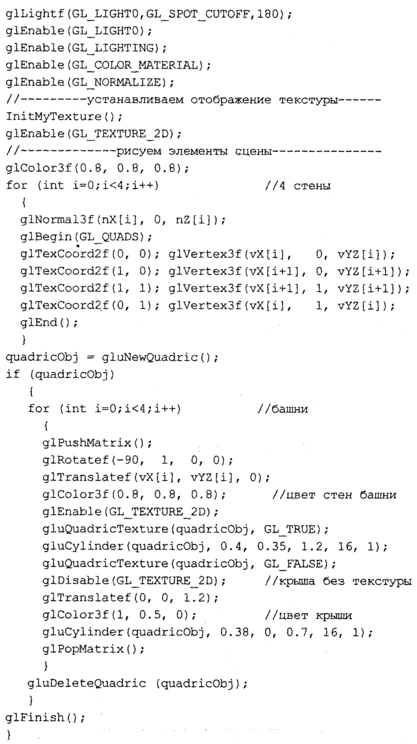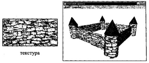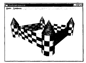В этой программе текстура загружается в массив всякий раз при создании, кадра. В данном примере это вполне допустимо, однако в других случаях такой подход может быть плохим по быстродействию. Поскольку дисковые операции являются медленными (особенно при чтении нескольких различных файлов больших размеров), то чтение файлов текстур нужно стараться делать как можно реже. Например, при построении кадров "облета замка" — to есть при "показе одних и тех же объектов с разных ракурсов, текстуры лучше всего загружать перед началом цикла показа. Если используются несколько текстур, то для каждой можно создать в памяти отдельный массив.