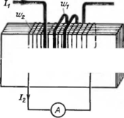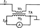 вило, равным 5 А. На рис. 2.24 показано включение амперметра во вторичную обмотку трансформатора тока. Здесь w, — первичная обмотка; w2 — вторичная; 1Х и 12 — соответствующие токи.
