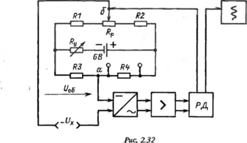 Автоматические компенсаторы постоянного тока. Измерения ручными компенсаторами требуют много времени. При этом не обеспечивается непрерывное слежение за текущим значением измеряемой величины. Непосредственное использование схемы, представленной на рис. 2.31, для построения автоматических компенсаторов неудобно из-за трудности автоматизации описанных выше последовательных этапов процесса измерения, таких, как установка рабочего тока, сравнение измеряемого и известного напряжений, считывание результата измерения и т.д. Поэтому для построения автоматических компенсаторов используют другие схемы. Одна из наиболее распространенных приведена на рис. 2.32. В данном случае измеряемое напряжение Ux должно быть скомпенсировано напряжением Uqq, возникающим между точкой а и подвижным контактом б резистора jRp, выполненного в виде реохорда. Если компенсации нет, то некомпенсированная разность Ux — UQ^ (после преобразования ее в переменное напряжение вибропреобразователем и усиления усилителем переменного тока) воздействует на реверсивный двигатель РД. Механическая связь двигателя с подвижным