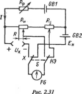 Компенсаторы постоянного тока обычно выполняются по принципиальной схеме, приведенной на рис. 2.31. Источник постоянного тока GB1 обеспечивает протекание рабочего тока / в цепи, составленной из последовательно соединенных резисторов: измерительного RK, установочного Ry и регулировочного jRp. Зажимы НЭ (на схеме не показаны) служат для подключения нормального элемента GB2, а зажимы Ux — для подключения измеряемого напряжения. При помощи переключателя S гальванометр PG можно включать либо в цепь нормального элемента (положение НЭ), либо в цепь измеряемого напряжения (положение X)