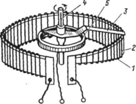 Устройство преобразователя показано на рис. 4.6. Он состоит из каркаса 1, на который намотан провод 2, изготовленный Из материала с высоким удельным сопротивлением, и токосъемного движка 3, укрепленного на оси 4. Движок касается провода 2. Для обеспечения электрического контакта в месте касания обмотка зачищается от изоляции. В показанной конструкции контакт с подвижным движком осуществляется с помощью неподвижного токосъемного кольца 5.