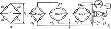 пряжения моста. Принципиальная схема тензорезисторного прибора типа КСТЗ, в котором реализован этот метод и который предназначен для использования в силоизмерительных и весоизмерительных системах, приведена на рис. 4.13, б.