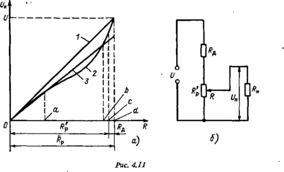 Для уменьшения погрешности следует уменьшать а, т.е. увеличивать RH. Однако практически значения сопротивления нагрузки часто невелики. В этом случае для уменьшения .погрешности можно более рационально выбрать номинальную функцию преобразования. Пусть действительной функцией преобразования является кривая 2. В качестве номинальной функции преобразования более целесообразно принять прямую 3. При этом, как видно из графика, на интервалах 0 — а, а — Ъ, Ъ — с погрешность значительно уменьшена. Уменьшена она и на интервале с — d, хотя остается довольно большой. Для того чтобы погрешность всюду была малой, диапазон изменения сопротивления преобразователя следует ограничить значением i?p, а добавочное сопротивление Ra = = Rp — Rp выполнить на отдельном резисторе и включить его последовательно с преобразователем (рис. 4.11, б).