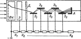Фотоэлектронный умножитель (ФЭУ) — это вакуумный фотоэлемент, снабженный системой электродов для усиления тока фотоэмиссии. Принципиальная схема ФЭУ показана на рис. 4.45. Свет падает на фотокатод ФК, который эмитирует электроны. Поток электронов фокусируется электрическим полем, создаваемым электродом Э, формируется диафрагмой Д и направляется на ускоряющий электрод— динод Эх. Напряжение на диноде таково, чтобы энергии фотоэлектрона было достаточно для вторичной эмиссии электронов. Режим работы таков, что при вторичной эмиссии испускается больше электронов, чем падает на динод. Так происходит усиление потока электронов. Поток электронов, усиленный динодом Эх, направляется на следующие диноды Э2 — Э5, усиливается и собирается анодом А. Анодный ток ФЭУ довольно мал и требует дополнительного усиления. Для это-' го он преобразуется в напряжение с помощью сопротивления RH. Питание ФЭУ производится с помощью делителя напряжения Rx — R$. Фотоэлектронные умножители имеют высокую чувствительность и