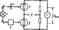 Для уменьшения погрешности измерения фотоэлектрические преобразователи включаются в дифференциальные или компенсационные измерительные цепи. Дифференциальная схема с двумя фотоэлектрическими преобразователями, служащая для измерения концентрации раствора, приведена на рис. 4.49. Первый луч света от источника 1 проходит через объект, измерения 2, например через кювету с исследуемым раствором, и попадает на фоторезистор 3. Второй луч проходит через применяемый для настройки прибора оптический клин 4 и попадает на второй фоторезистор 5. Фоторезисторы включены в мостовую цепь. Благодаря дифференциальной схеме компенсируются температурные и другие аддитивные погрешности. Однако вследствие разброса характеристик и параметров фотоэлектрических преобразователей каналы дифференциальной цепи несколько отличаются друг от друга, и компенсация t получается неполной. Достоинством схемы является ее пригодность для измерения быстропеременных величин. Инерционность прибора обусловливается инерционностью фотоэлектрических преобразователей и выходного прибора.