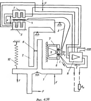 1, то характеристика преобразователя полностью определяется преобразователем обратной связи. Изменение характеристик прямого преобразователя 1 мало влияет на характеристики сложного преобразователя с обратной связью. Погрешность сложного преобразователя (4.49) в основном определяется погрешностью преобразователя 2 обратной связи. Когда требуется линейная функция преобразования сложного преобразователя силы в унифицированный электрический сигнал, в качестве преобразователя 2 применяется магнитоэлектрический преобразователь. Известно, что он является наиболее точным электромеханическим обратным преобразователем с линейной функцией преобразования.