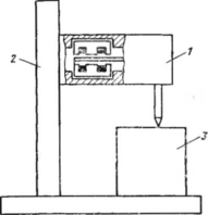 Датчики, подобные показанному на рис. 4.62, используются для контроля размеров в машиностроении. Известно, что реальные размеры деталей отличаются от номинальных заданных. Отличие реальных размеров от номинальных и измеряется описываемыми приборами. На рис. 4.63 приведен пример одного из таких приборов. Датчик 1 смонтирован на стойке 2 и при наладке прибора может по ней перемещаться. Он устанавливается на такой высоте, чтобы нулевой отсчет прибора соответствовал номинальному размеру детали 3. Диапазон измерения таких микрометров обычно не превышает 1 мм.
