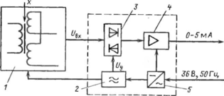Выходное напряжение преобразователя 1 подается на фазочувствительный выпрямитель 3. Это управляемый выпрямитель, причем полярность выпрямленного напряжения зависит от совпадения или несовпадения фаз входного напряжения /7ВХ и управляющего Uy. Управляющее напряжение подается от генератора 2 и имеет постоянную фазу. Фаза входного напряжения изменяется на 180 ° при изменении знака смещения якоря. Напряжение на выходе фазочувствительного выпрямителя пропорционально смещению якоря и имеет полярность, зависящую от его направления. Это напряжение усиливается усилителем 4 и преобразуется в унифицированный токовый сигнал 0—5 мА. Для увеличения стабильности усилитель имеет отрицательную обратную связь. Изменением глубины обратной связи регулируется максимальное значение выходного тока. Все элементы схемы питаются от сети переменного тока через источник стабилизированного напряжения' 5.