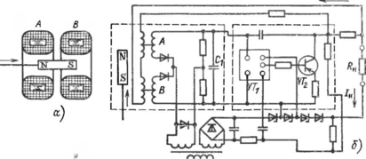 Магнитомодуляционные датчики. Схема модуля с магнитомодуля-ционным преобразователем приведена на рис. 4.61. Он состоит из маг-нитомодуляционного преобразователя (рис. 4.61 ,а) и электронного блока (рис. 4.61,6). Магнитомодуляционный преобразователь имеет две катущки, намотанные на кольцевые ферромагнитные сердечники. Соосно с катушками в соответств и со значением измеряемой величины перемещается постоянный магнит N — S. Его перемещение вызывает изменение индукции в сердечниках катушек и, следовательно, индуктивности катушек. Например, при перемещении сердечника вправо индукция в катушке А уменьшается, а в катушке В возрастает.