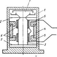 В качестве неподвижной точки может служить сейсмическая масса сейсмического датчика вибрации. Сейсмический датчик вибрации схематически показан на рис. 4.74. Он состоит иэ корпуса 1, в котором на плоских пружинах 2 укреплена ферромагнитная сейсмическая масса 3. На корпусе смонтирован кольцевой постоянный магнит 4 с полюсными наконечниками 5. Магнитный поток постоянного магнита проходит через полюса и сейсмическую массу. На последней в магнитном поле находятся две катушки б, соединенные встречно (дифференциально). При движении сейсмической массы относительно корпуса в катушках наводится ЭДС, пропорциональная скорости ее движения. Она пропорциональна измеряемой скорости вибрации корпуса относительно неподвижной точки. Диапазон рабочих частот определяется частотными характеристиками сейсмического вибродатчика. Для улучшения частотных характеристик и уменьшения частотных погрешностей в датчике имеется воздушный демпфер 7.